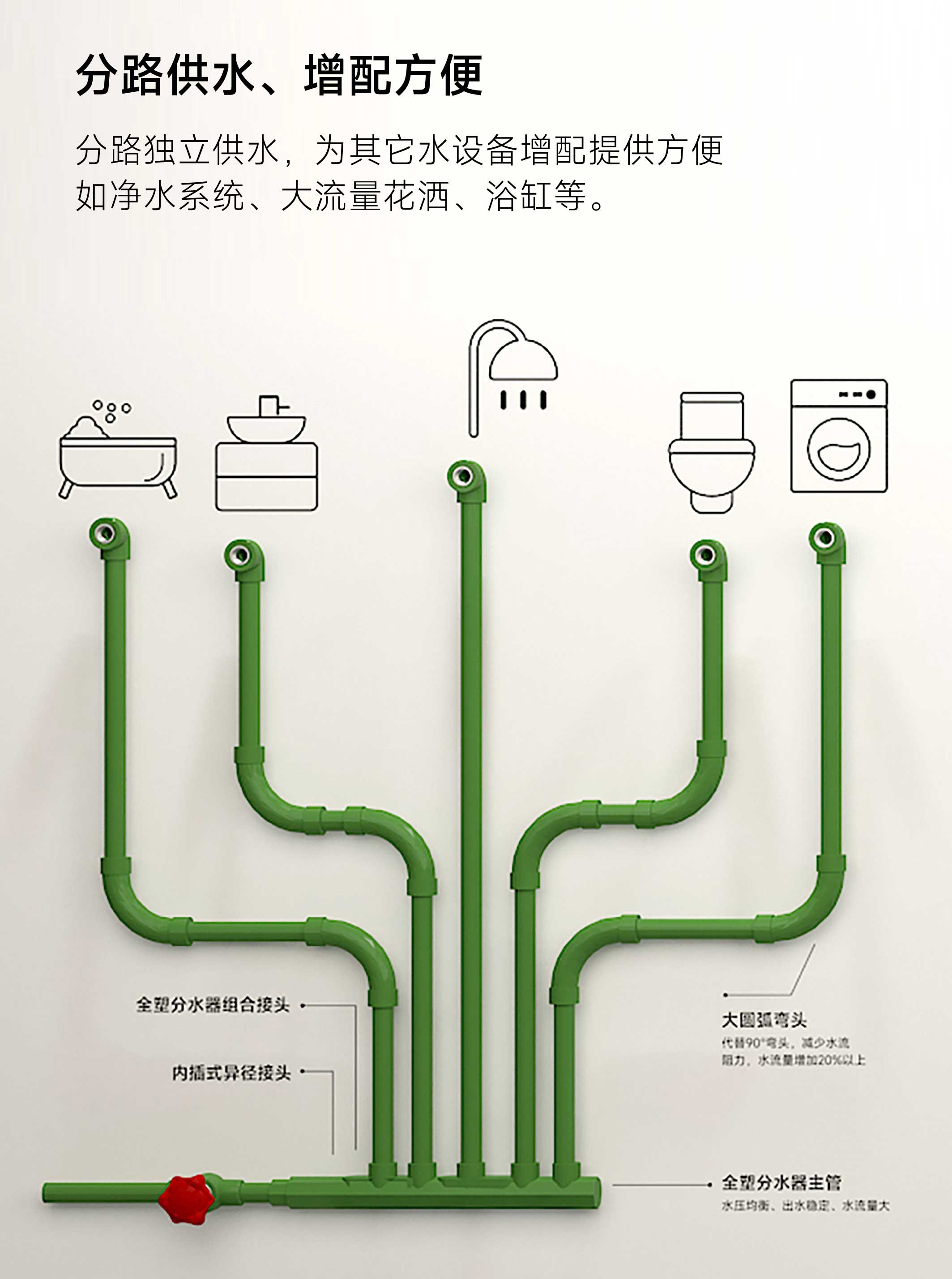 k8凯发官网分路供水系统,是一种采用分水器给各处的用水点分路供水的新型家用供水系统。像平常家里多个用水点同时用水时,水流会忽大忽小,及其不稳定。k8凯发分路供水系统,每一路供水的水压互不影响,保持稳定。一路水管配一个阀门,实现每一路供水单独控制。假如某一路供水出现了问题,那么只需把对应的阀门关闭,进行维修就好了,不影响其他用水点正常用水。